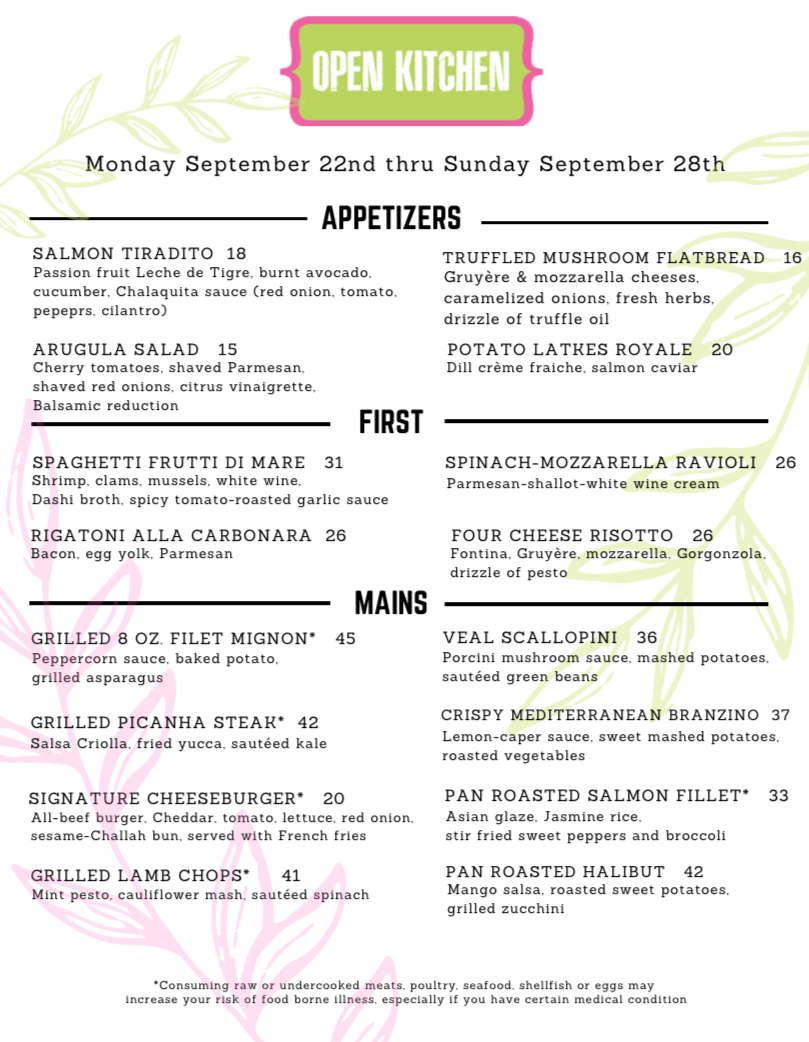 Breakfast, Brunch (available Saturday & Sunday), Lunch, Dinner (changes weekly)